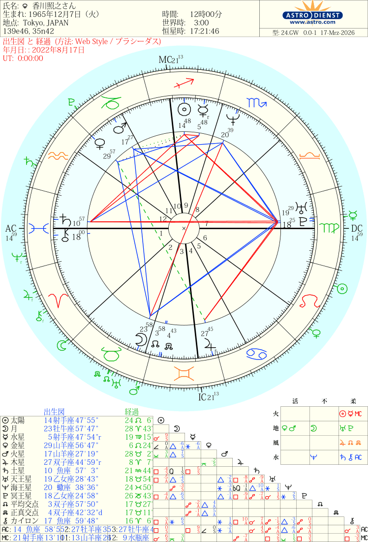 香川さんの場合は土のグランドトラインが出来ていて、そこに冥王星天王星180度土星と、海王星180度月のカイト二本がささっていて、土の伝統的な芸能や型の世界を、ずっとやっていけるパワーがバリバリにあふれているのでございます。