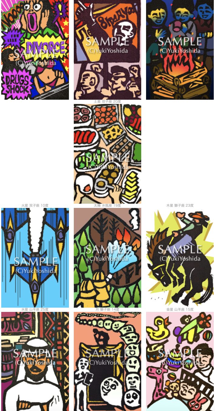 私はサビアンシンボル360個を消しゴムハンコに彫って絵にしました。この10個のイメージは人間の転生してきた魂のかけらがより集まったものだと思います。彼の10個の天体のサビはんはこちら