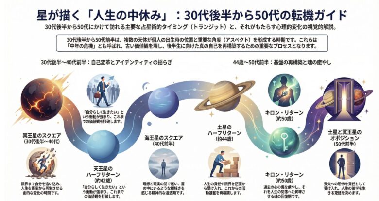 占星術の世界では、40歳前後から50代前半にかけて、誰もが通る中年の危機(ミッドライフ・クライシス)と呼ばれる天体の配置があります。